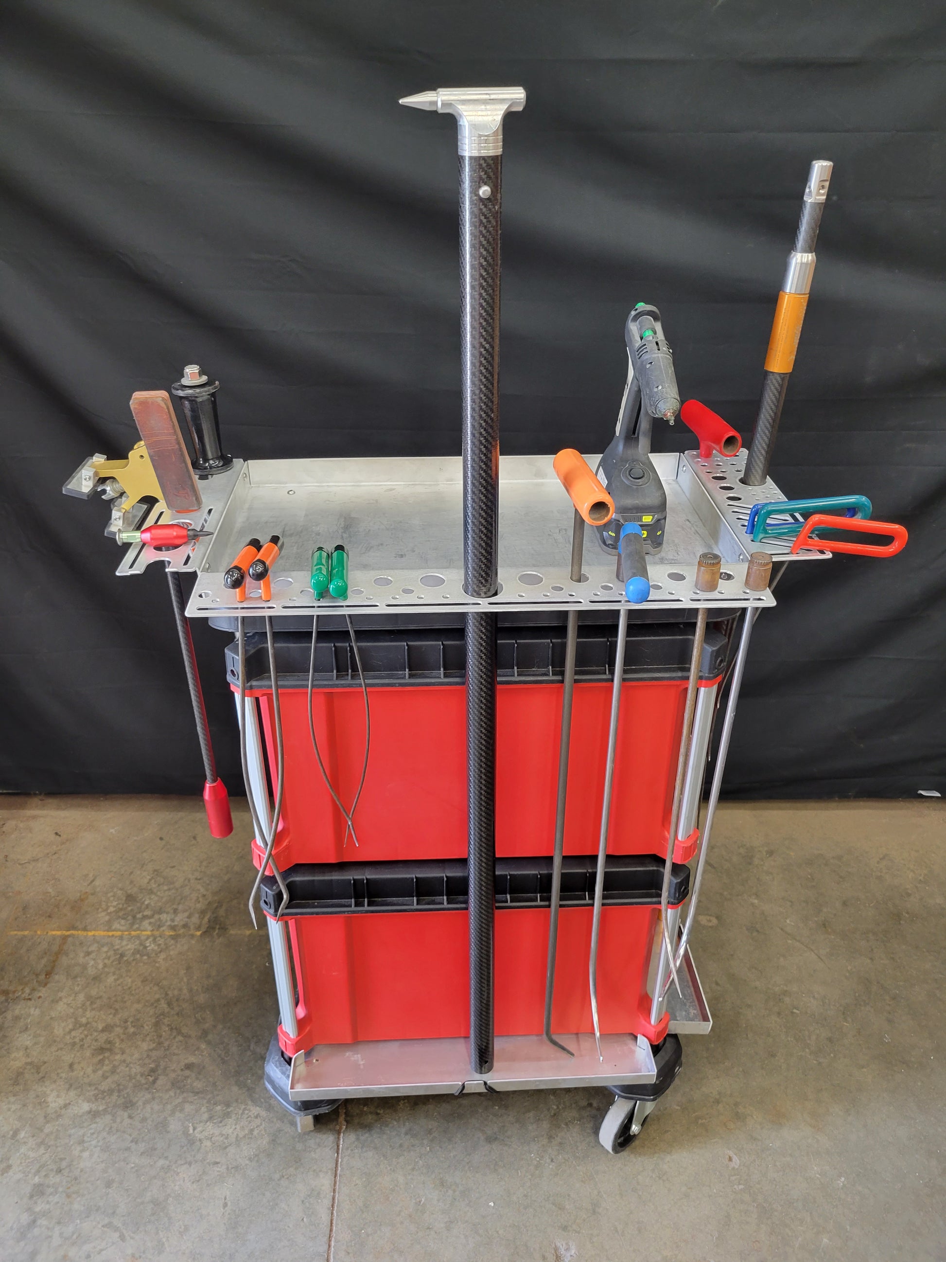 Packout Rear Tool Trays allow you to leave your tools in a desired location, while being able to remove trays from the Main Cart for quick storage or setup. The days of loading each individual rod or hand tool at each stop can now be a thing of the past.  Packout Rear Tool Trays can accommodate up to 1-5/8" hail rod.
