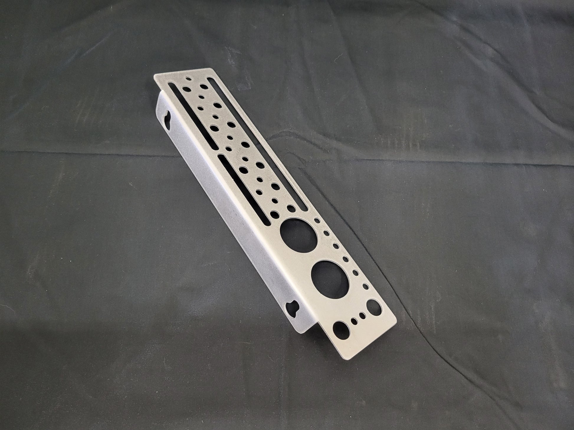 This is the XL tray version of the Ben Wilson design that Fit his needs for large handled blending hammers along with a mix of wholes and slots, along with a spot to hang loc-line. The 2) 1.75" holes are also great for holding Carbon Techs Hail Rod when broken down into two sections